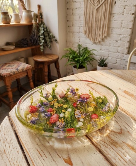 Centrotavola ovale con avena rosa nigella e foglie di eucalipto al suo interno. Ideale come portafrutta (cioccolatini NON inclusi)